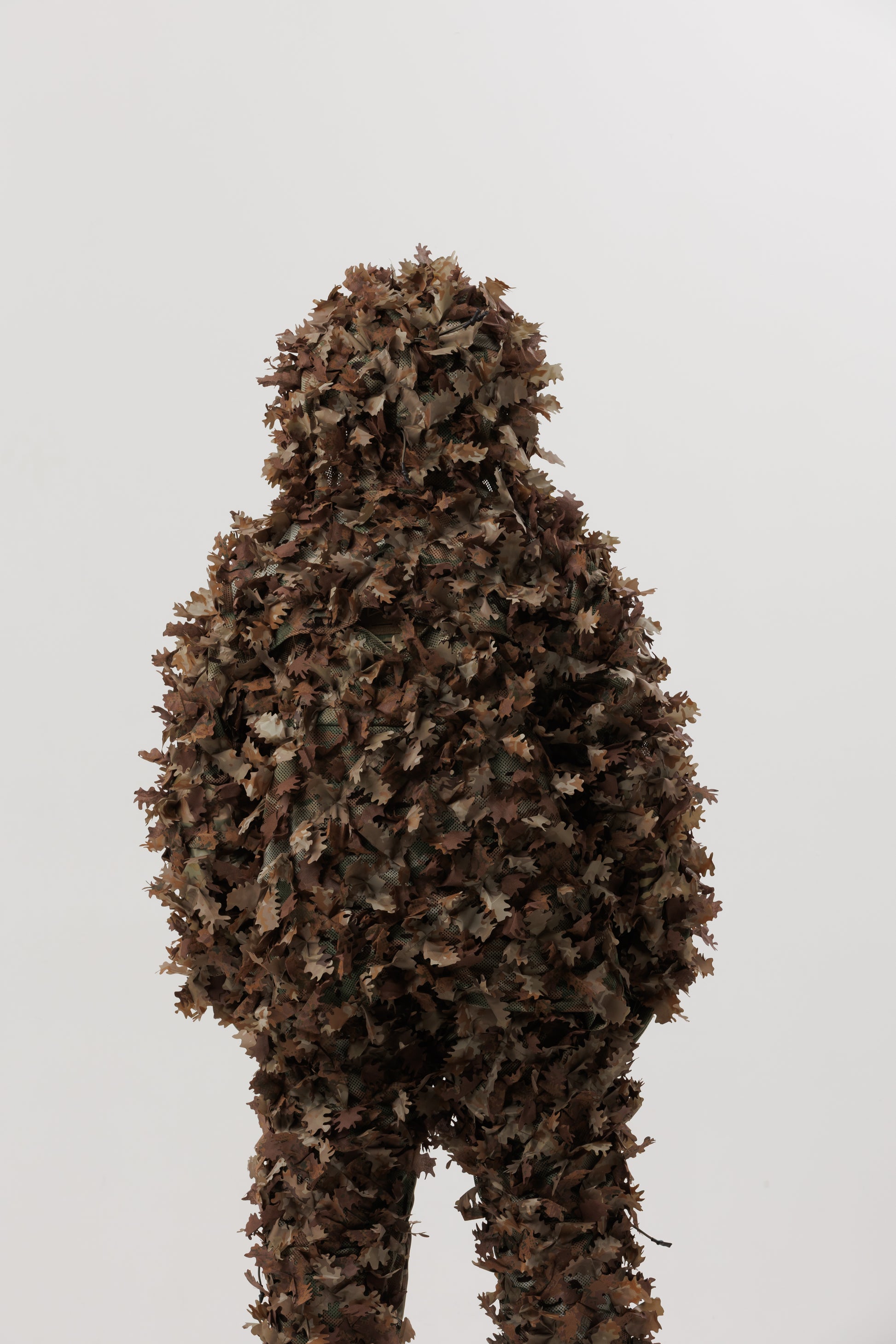 The suit's surface features camouflage strips in the shape of leaves. Each strip has unstitched sections (1–1.5 cm), allowing for easy attachment of additional camouflage elements such as grass, jute, fabric scraps, or artificial foliage from our production in other colors.
