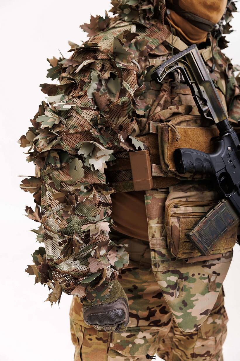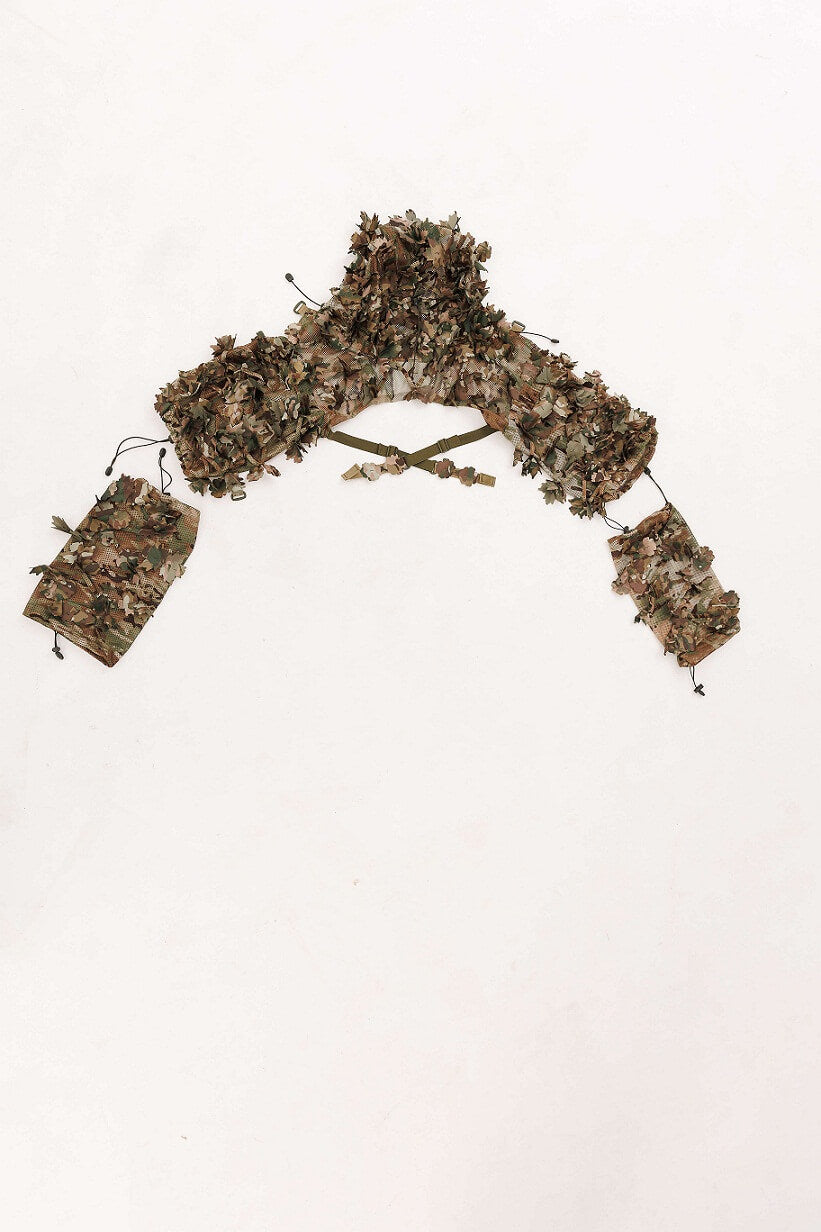 Viper hood is made of a special camouflage mesh fabric. Thanks to this, the cape is lightweight, has excellent ventilation, and is durable. The size is universal: it is regulated by tightening the rubber cords on each part of the cape. The leaves are double-sided. For additional camouflage with natural vegetation, there are slings that are sewn in a zigzag pattern for better fixation. The cloak consists of two parts: the cloak itself (hood, shoulders, sleeves) and armbands. The materials do not glow in night vision devices.